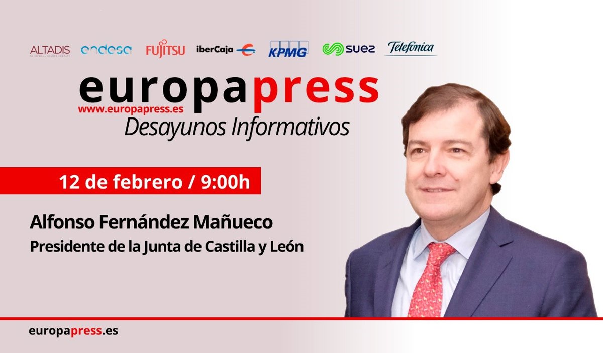 El presidente de la Junta de Castilla y León, Alfonso Fernández Mañueco, participará este miércoles, 12 de febrero, en los Desayunos Informativos que la Agencia Europa Press celebra en Madrid.