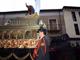 Éste es el castigo reducido que el indultado asumirá tras recorrer junto a la talla de la Quinta Angustia, realizada por Gregorio Fernández en torno a 1625, las abarrotadas calles vallisoletanas. Esta Cofradía alumbra también en este desfile el paso 'Cristo de la Cruz a María', atribuido a la escuela del imaginero vallisoletano.