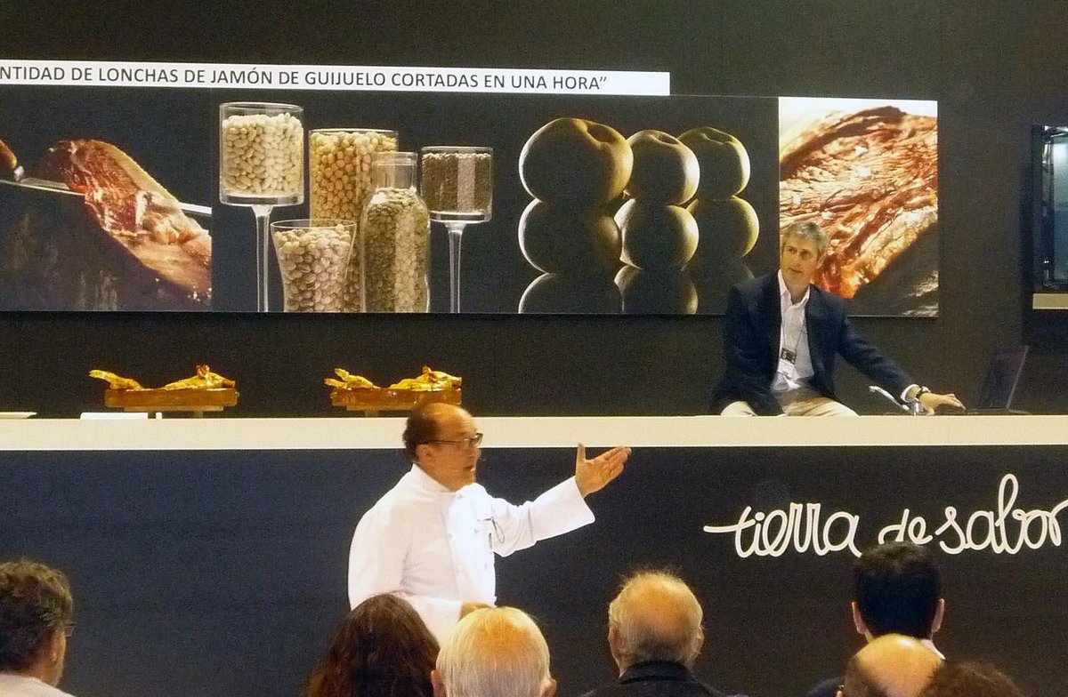 José María demostró la ternura de los cochinillos a los cuales partió ante el público con el borde de un plato. Posteriormente, se ofreció una degustación.