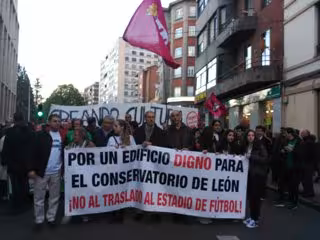 Profesores, alumnos y padres de alumnos del conservatorio de León han salido a la calle este jueves para exigir a Junta y Ayuntamiento de León "un espacio digno" para albergar el futuro conservatorio provincial y para mostrar su rechazo al posible traslado de este centro educativo a la parte baja del estadio de fútbol 'Reino de León'.