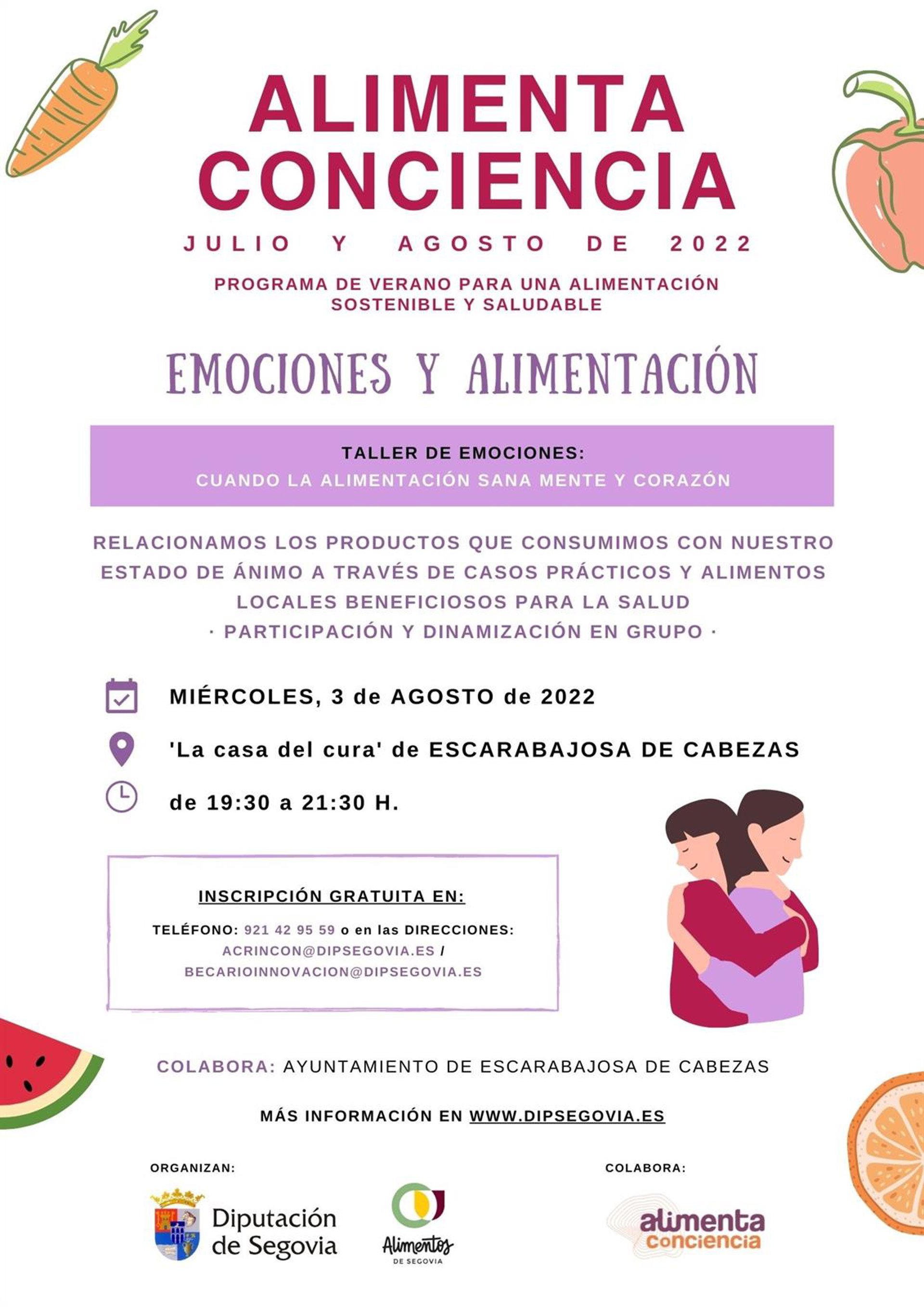 El miércoles 3 de agosto a las 18.30 horas, en el centro social 'La casa del cura' de Escarabajosa de Cabezas, se llevará a cabo el 'taller de emociones'. El objetivo es aprender cómo los alimentos que tomamos afectan a nuestro estado de ánimo y los participantes podrán preguntar dudas y curiosidades y se dará a probar algunos ejemplos de almuerzo saludable realizado con producto local de la zona, detalla la Diputación.