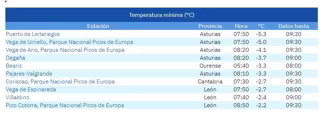 En segunda posición, Vega de Urriellu Parque Nacional Pico de Europa (Asturias) ha anotado -5 grados y en tercer lugar Vega de Ario Parque Nacional Picos de Europa (Asturias), -4,1, seguida de Degaña (Asturias), con -3,7, y Beariz (Ourense), con -3,3, al igual que Pajares-Valgrande (Asturias), mientras en séptima posición, Coriscao Parque Nacional Picos de Europa (Cantabria) ha marcado -2,7 grados.