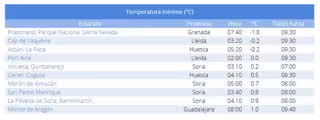 Pradollano Parque Nacional de Sierra Nevada (Granada) lidera las temperaturas mínimas con -1,8 grados; seguida de Cap de Vaquèira (Lleida), con -0,2, misma temperatura que ha anotado Astún-La Raca (Huesca), mientras Port Ainé se ha colocado en cuarta posición con 0 grados, seguida de Vinuesa (Soria), con 0,2 grados.