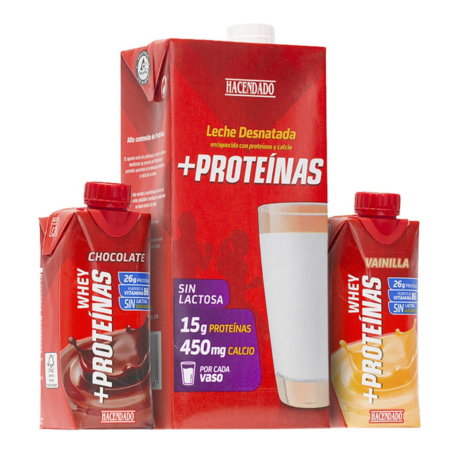 La otra variedad es Leche desnatada +Proteínas Hacendado, una leche desnatada sin lactosa enriquecida con calcio y proteínas. La referencia se presenta en formato brick, junto a la leche tradicional. Ofrece la mitad de grasas saturadas, una ligera reducción de azúcares, un 90 por ciento más de proteínas y un 65 por ciento más de calcio.