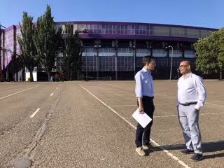 Pedro Herrero y Luis Vélez, con el estadio al fondo. - PSOE