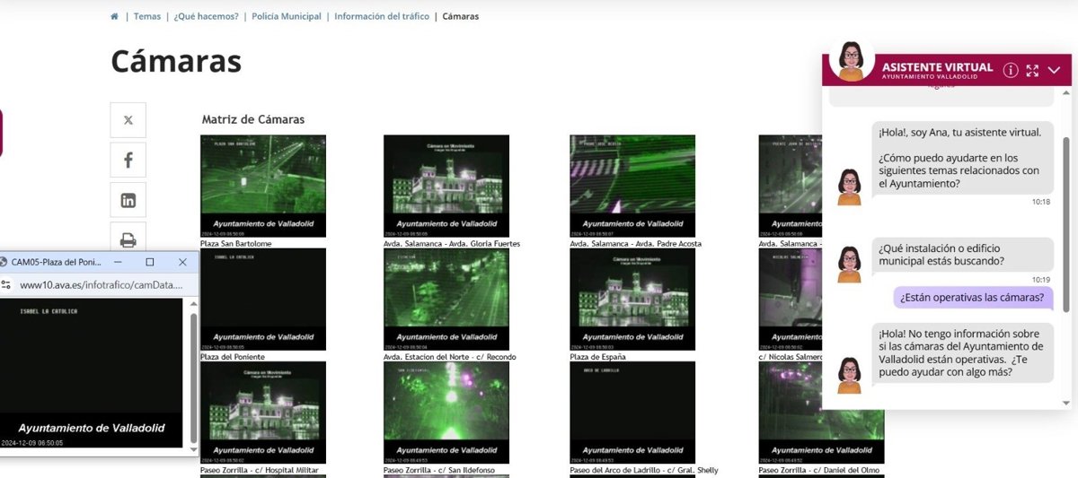 El Grupo Socialista ha compartido también con los medios de comunicación una captura de pantalla de una conversación con el 'chatbot' virtual de asistencia, 'Ana', a la que preguntan de manera escueta "¿Están operativas las cámaras?" a lo que el dispositivo responde que no tiene información sobre si "las cámaras del Ayuntamiento
