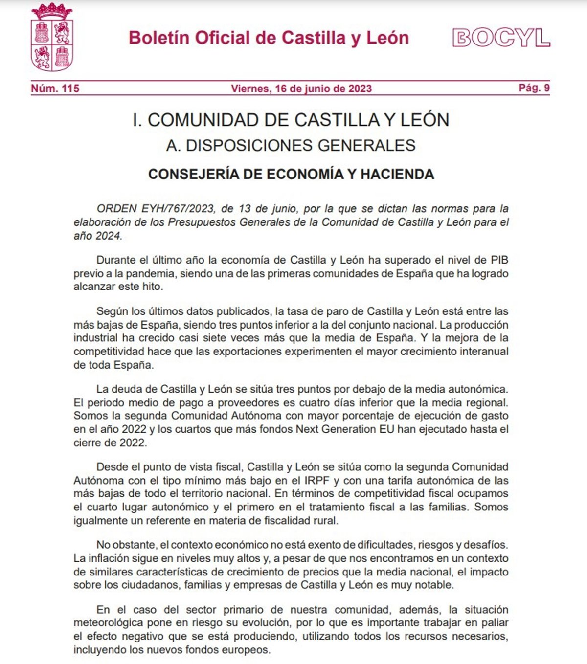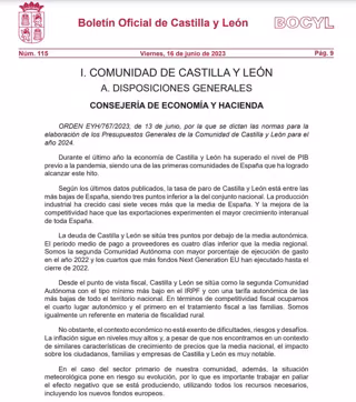 La Junta publica en el Boletín Oficial de Castilla y León (Bocyl) de este viernes, 16 de junio, la Orden de elaboración de los presupuestos generales de la Comunidad para el año 2024 por la que se dictan las normas para elaborar las cuentas de la Comunidad para el próximo ejercicio.