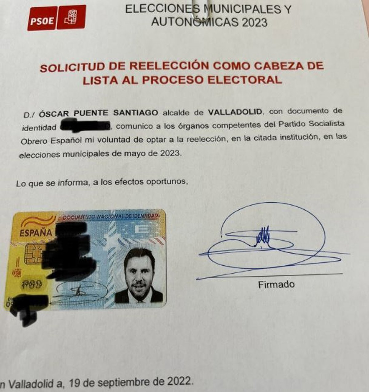 El alcalde de Valladolid, Óscar Puente, ha presentado este lunes la solicitud para ser candidato a la Alcaldía de Valladolid en las elecciones municipales de 2023 a las que asegura que llega "muy bien, cargado de pilas a todos los niveles, personal y político" y con "más ganas que nunca".