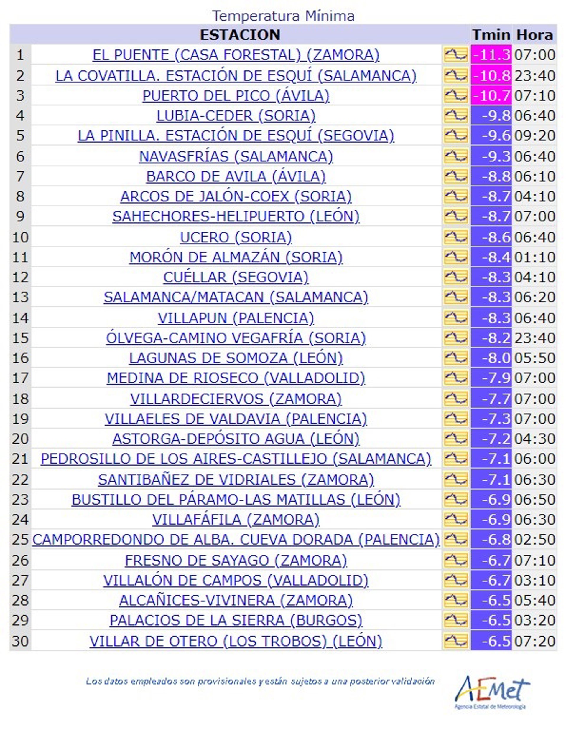 Se da la circunstancia de que las mínimas que cierran el ranking de las 30 mínimas anotadas en Castilla y León también están en negativo: Villar de Otero (León), Palacios de la Sierra (Burgos) y Alcañices (Zamora), todas con -6,5 grados.