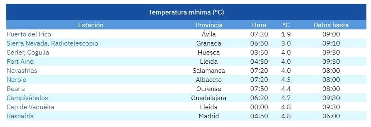 Lista de las diez temperaturas más bajas de España en la mañana de este domingo, 19 de abril de 2026. - AEMET