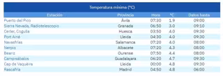 En segunda posición, Sierra Nevada Radiotelescopio (Granada) ha anotado 3 grados, seguida de Cerler Cogulla (Huesca), Por Ainé (Lleida) y Navasfrías (Salamanca), que han marcado 4 grados.
