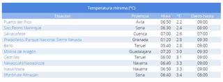 En segunda posición, San Pedro Manrique (Soria) ha marcado 2,4 grados, seguida de Salvacañete (Cuenca), con 2,6; Pradollano Parque Nacional de Sierra Nevada (Granada) y Bello (Teruel), con 2,8 en ambos casos, y Molina de Aragón (Guadalajara), con 3 grados.
