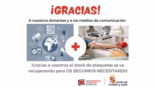 Según informa el Centro de Hemoterapia y Hemodonación de Castilla y León a través de las redes sociales, el stock de plaquetas "se va recuperando" si bien insiste en el llamamiento a la solidaridad de los ciudadanos ya que las donaciones aún son necesarias --de cada cinco donaciones de sangre se obtiene una bolsa de plaquetas--.
