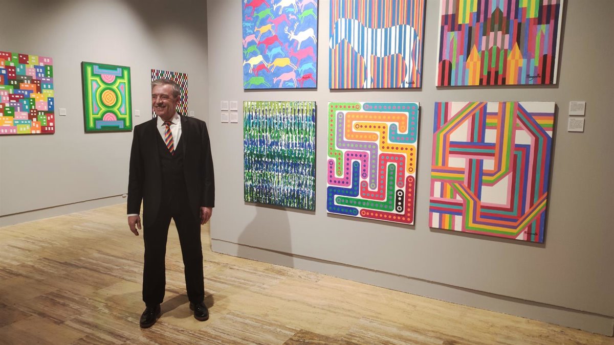 El artista Ramón Margareto delante de algunas de sus obras en la exposición de Palencia. - EUROPA PRESS