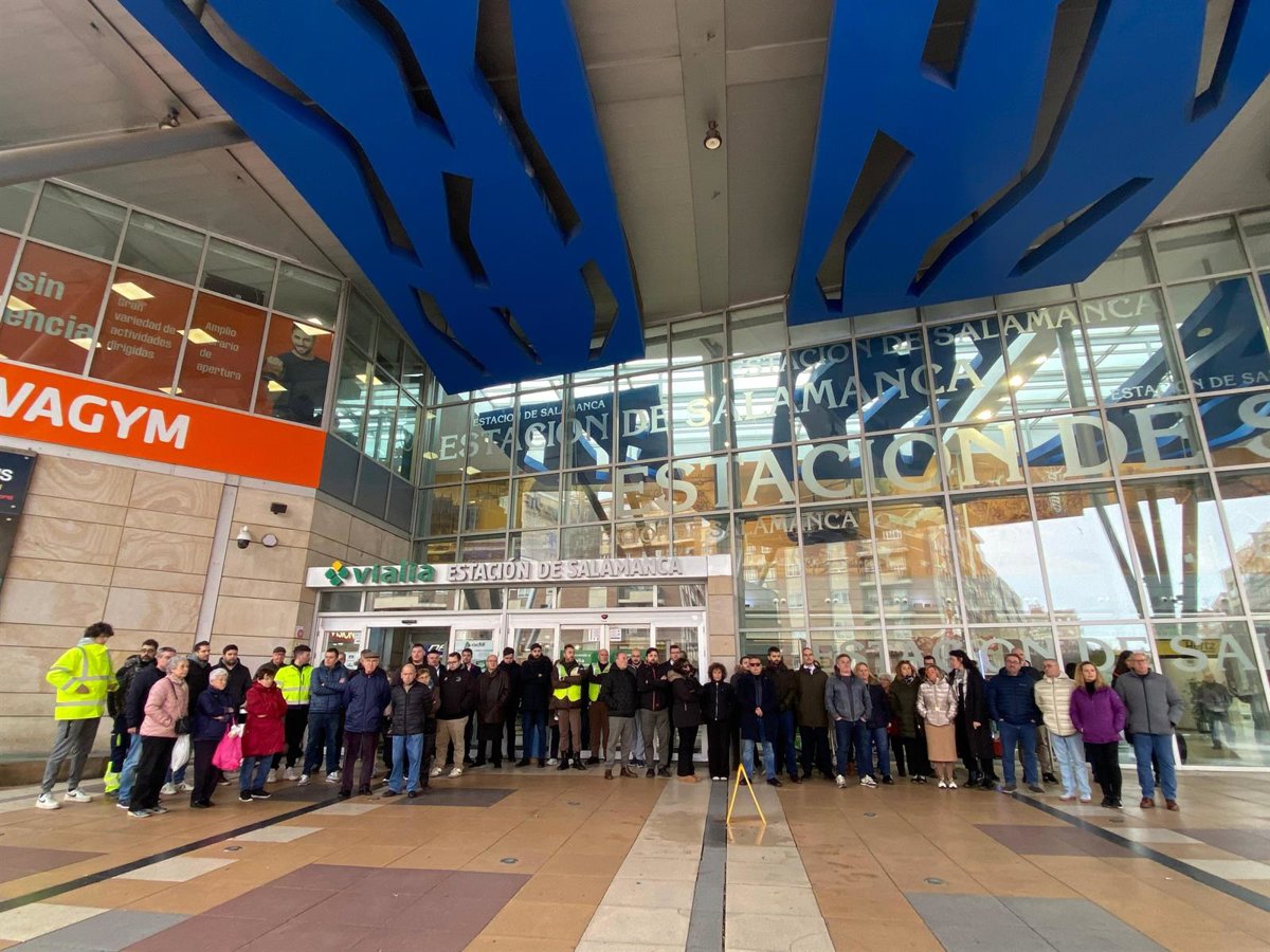 Representantes de UGT en el sector ferroviario y en Adif en Salamanca han guardado cinco minutos de silencio a las puertas de la estación de trenes de Vialia en recuerdo de las víctimas del accidente de Adamuz (Córdoba).