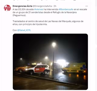 Efectivos de los Bomberos de Ávila han rescatado esta noche a un grupo de 21 senderistas desde el refugio de la Naranjera, en el municipio abulense de Pereguinos, de los que siete jóvenes presentaban síntomas de hipotermia leve