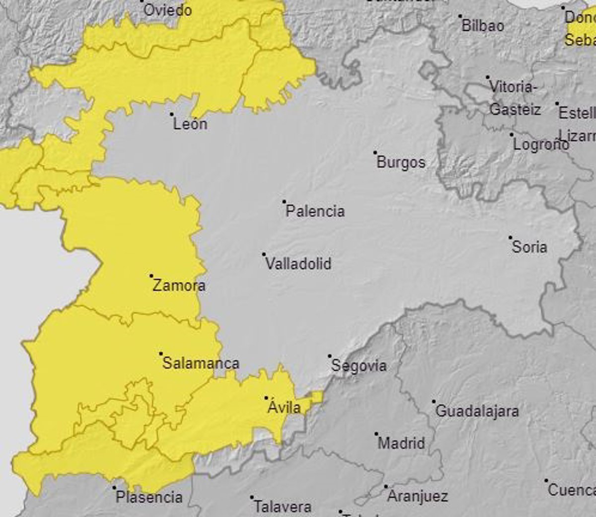 Mapa elaborado por la Aemet sobre el aviso por lluvia y viento para este lunes, 19 de octubre - @AEMET_CYL