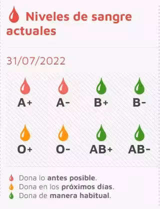 Por su parte, las reservas del resto de los grupos de sangre, B+, B-, AB+ y AB-, están en verde, por lo que no hay déficit en estos momentos y basta con acudir a donar de manera habitual.