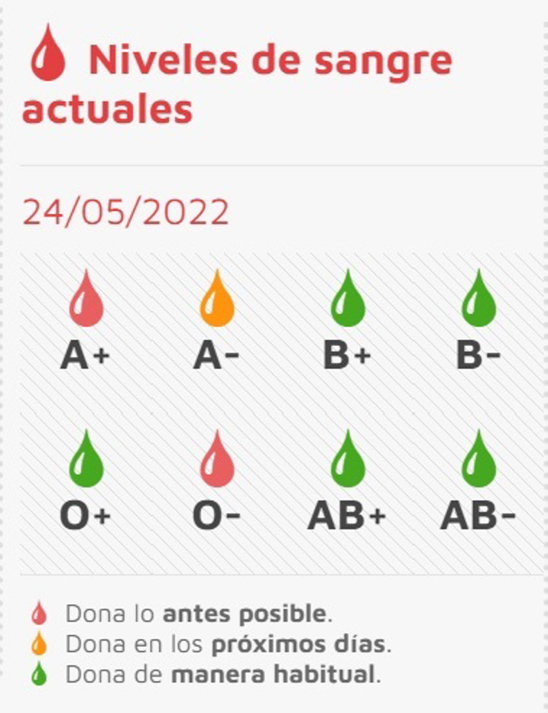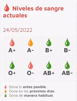 Las reservas del resto de los tipos sanguíneos, 0+, B+, B-, AB- y AB+, están en verde por lo que se llama a donar de forma habitual.