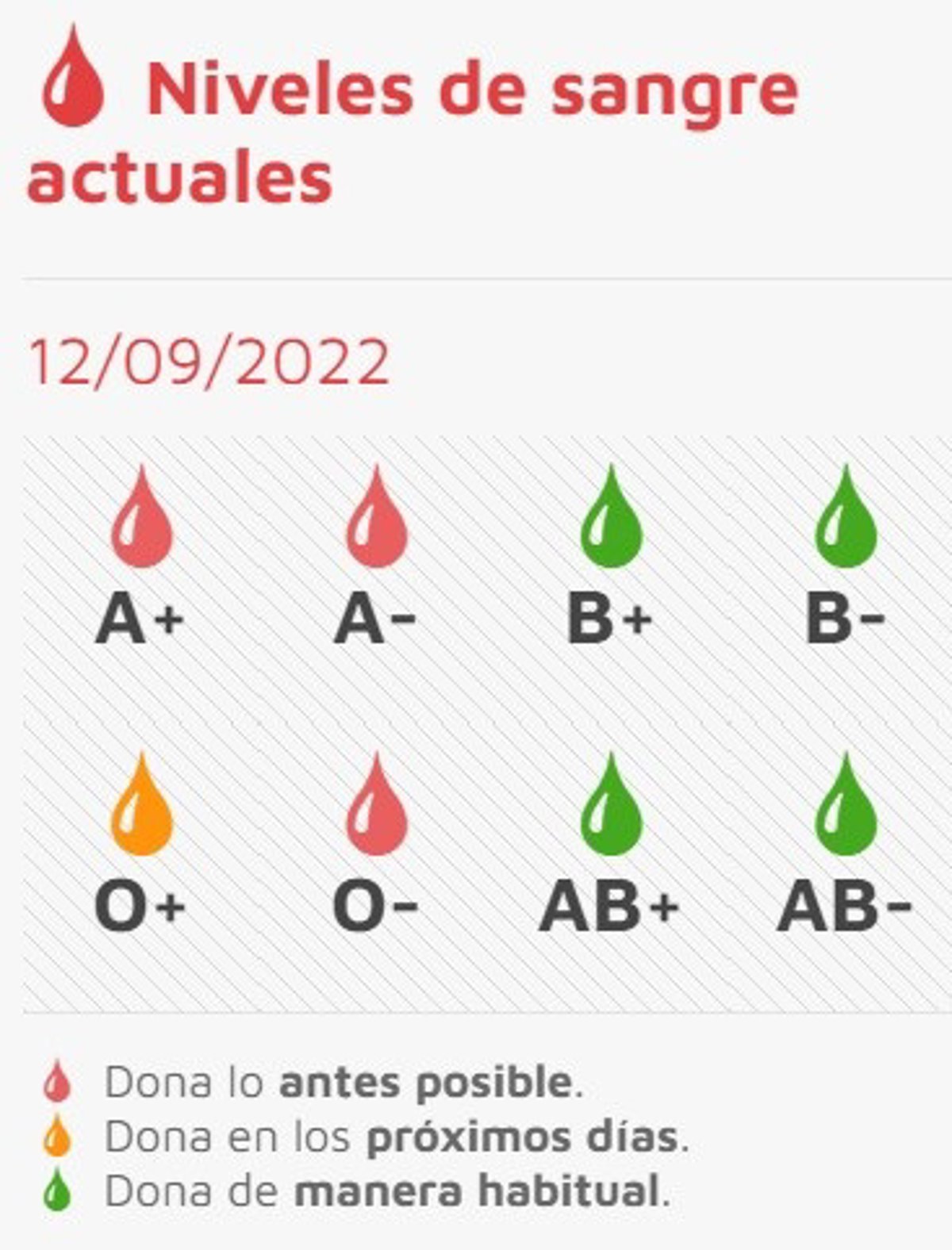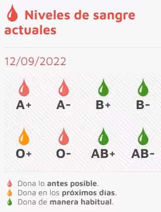 Por su parte, las reservas del resto de los grupos, AB+, AB-, B- y B+, están en verde por lo que se requieren donaciones "de manera habitual".