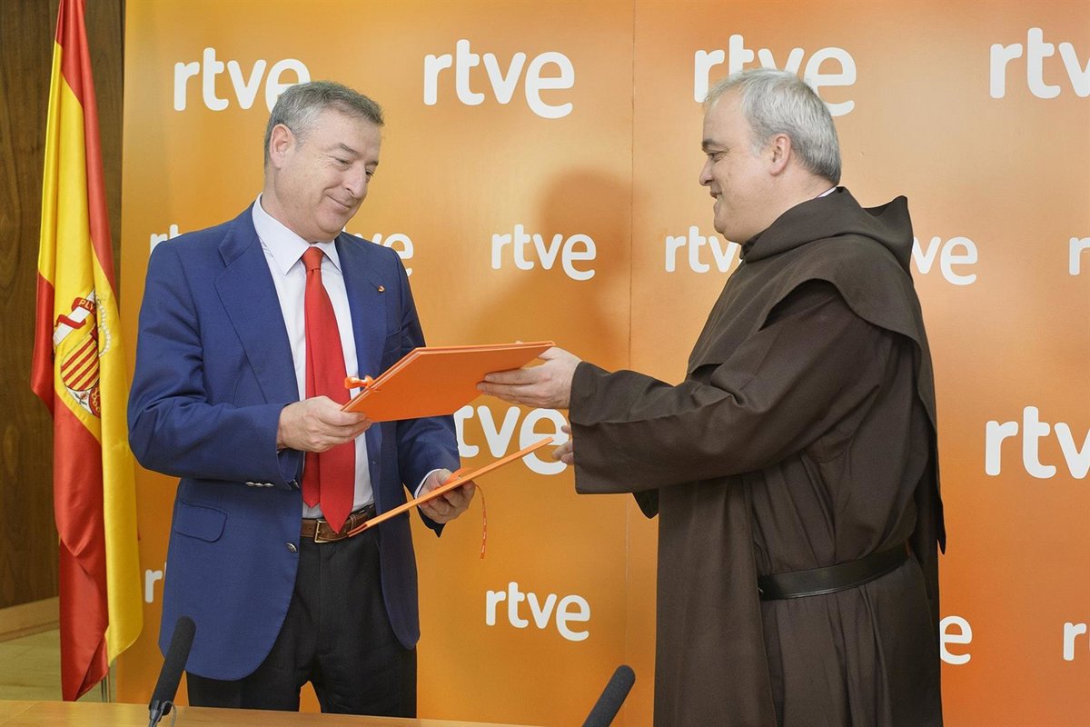 El presidente de RTVE, José Antonio Sánchez, y el vicario general de la Orden del Carmelo y presidente de la Fundación V Centenario del nacimiento de Santa Teresa de Jesús, Emilio José Martínez González, han firmado este viernes un convenio de colaboración para la difusión del V centenario del nacimiento de Santa Teresa de Jesús.