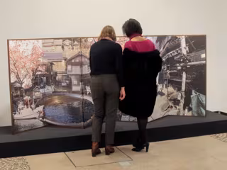 La especialidad de Chiho Miyamoto son las obras de gran tamaño mediante construcciones "tan abstractas como misteriosas", mientras que Kana Honda es la responsable de un biombo de estilo japonés formado por tiras de papel fotográfico. Esta última propuesta ha despertado la curiosidad de Mercedes Cantalapiedra, que se ha acercado a observar con detenimiento la composición.