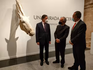El alcalde de Salamanca, Carlos García Carbayo, el presidente de la Fundación Venancio Blanco, Francisco Blanco, y el director general territorial centro de Mapfre, Antonio Vigil-Escalera del Pozo, de izquierda a derecha en la exposición. - EUROPA PRESS