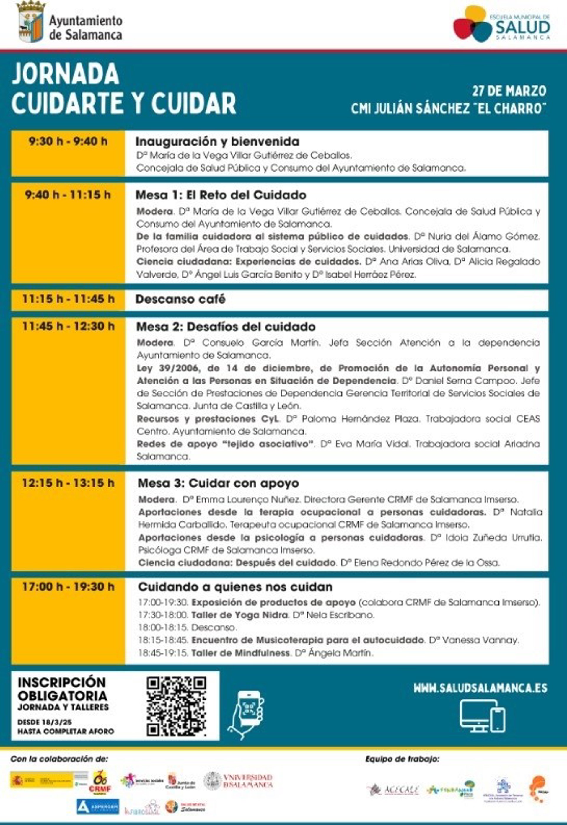 La asistencia está abierta a la población en general bajo inscripción previa que deberá realizarse a través del siguiente enlace: https://saludsalamanca.es/jornada-cuidarte-y-cuidar/ y la inscripción a los talleres prácticos no implica la obtención de la plaza, que será confirmada en el correo electrónico facilitado.