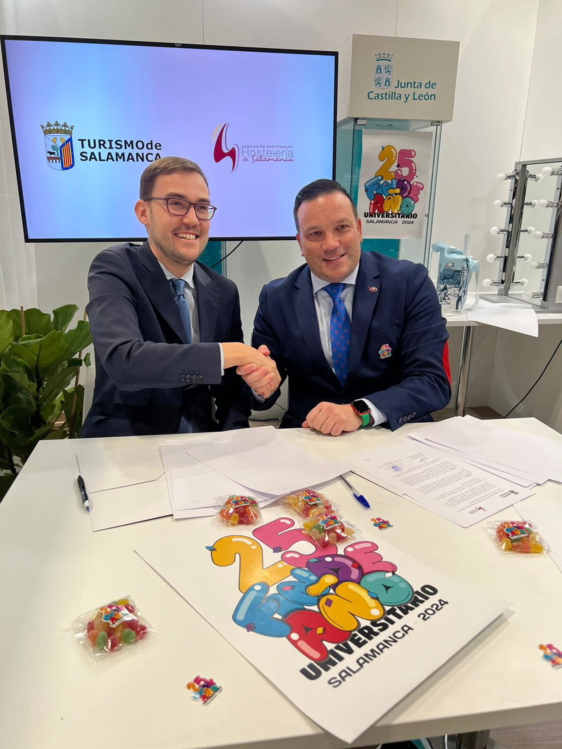 Para las 'bodas de plata' de este particular festejo, el concejal de Turismo del Ayuntamiento de Salamanca, Ángel Fernández Silva, y el presidente de la Asociación de Empresarios de Hostelería (AEHS), Jorge Moro, han firmado un convenio de colaboración en la Feria Internacional de Turismo (Fitur) en Madrid.
