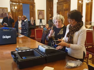 La delegada del Gobierno, Mercedes Martín (d), junto a la subdelegada en Salamanca, Encarnación Pérez (i), con un nuevo etilómetro para la provincia. - EUROPA PRESS.
