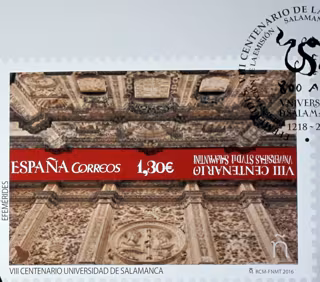 Respecto al último sello, sobre el VIII Centenario de la Universidad de Salamanca, la entidad postal distribuirá 240.000 unidades con una tirada única y en ellas se puede ver la imagen de la fachada plateresca de la institución académica.