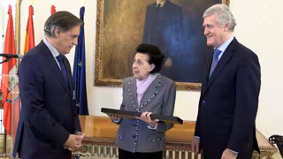 La hija de Cástor Iglésias, María Isabel Iglesias (c), entrega la batuta del director de la Banda Municipal de Música de Salamanca al alcalde de la ciudad, Carlos García Carbayo (i), en presencia del nieto del músico - EUROPA PRESS