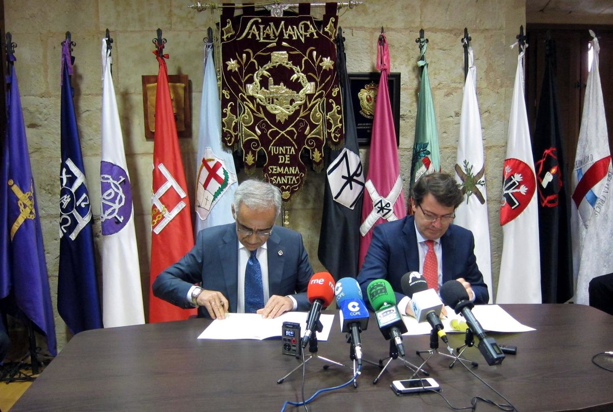 El apoyo económico viene dentro de la firma de un convenio de colaboración que ha firmado este lunes el alcalde de la ciudad, Alfonso Fernández Mañueco, con el presidente de la Junta de Cofradías, Hermandades y Congregaciones, José Cornejo, en la Casa de la Iglesia.