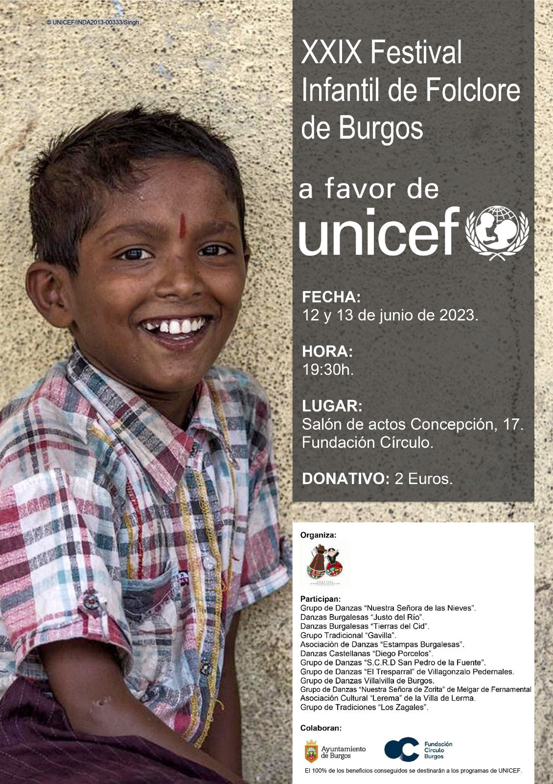 El Comité de Folclore Ciudad de Burgos organiza los días 12 y 13 de junio, a las 19.30 horas, el Festival de Folclore Infantil a favor de UNICEF en el en el Salón de Actos Fundación Círculo.
