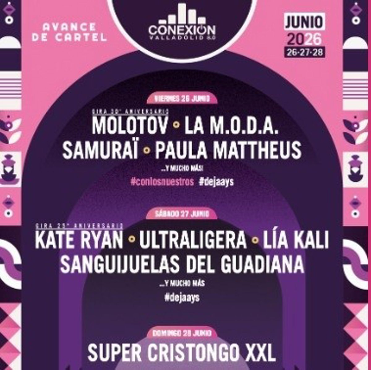 El festival Conexión Valladolid ha desvelado gran parte del cartel de su edición 2026, que se celebrará del 26 al 28 de junio y que contará con artistas nacionales e internacionales como Molotov, La M.O.D.A., Kate Ryan o Lía Kali.