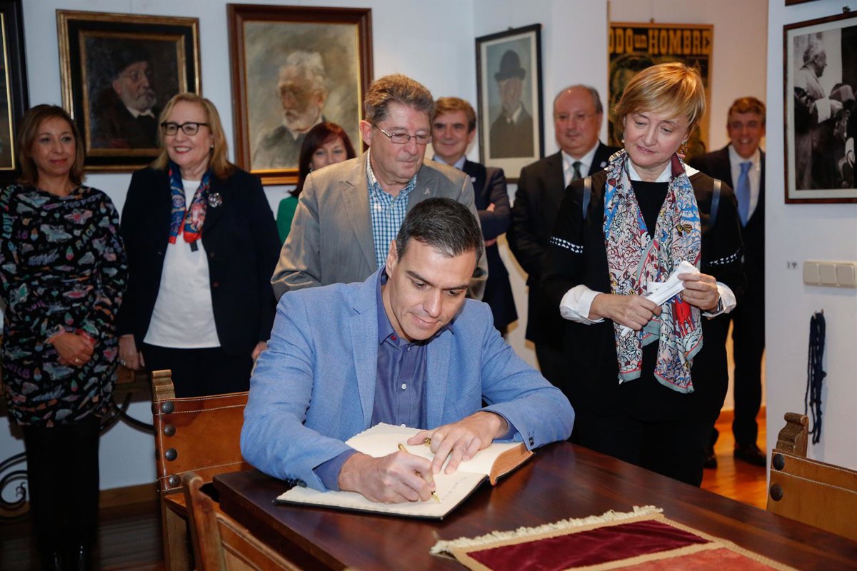 El presidente del gobierno en funciones, Pedro Sanchéz firma el libro de la Casa de Unamuno ante la mirada de la directora de la Casa Museo Unamuno, Ana Chaguaceda Toledano (2i), en la Casa Museo Unamuno, en Salamanca (España), a 23 de octubre de 2019. - Manuel Ángel Laya - Europa Press