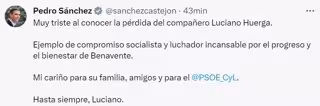 El líder del Ejecutivo central ha publicado un mensaje en su perfil oficial de 'X', del que se hace eco Europa Press, en el que ha destacado que la figura de Huerga como "ejemplo de compromiso socialista" y "luchador incansable" por el progreso y el bienestar de Benavente.