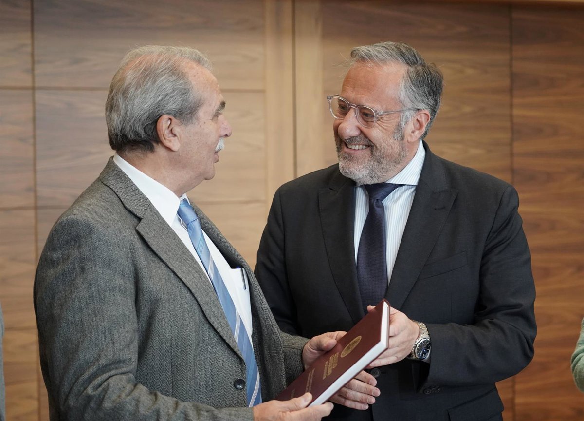 El presidente de las Cortes de Castilla y León, Carlos Pollán, ha recibido este jueves en su despacho al presidente del Consejo Consultivo, Agustín Sanchez de Vega, quien le ha hecho entrega de la Memoria de la institución correspondiente a 2024 - CORTES