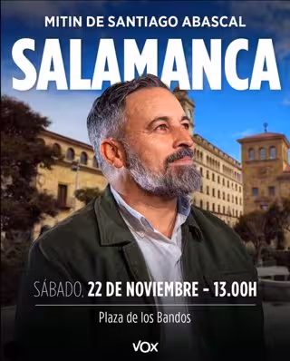 El líder de Vox, Santiago Abascal, ofrecerá un mitin en la Plaza de los Bandos de Salamanca el próximo sábado 22 de noviembre a las 13 horas, como así se ha publicado en las redes sociales de este partido político, que han señalado también que Abascal llegará a la capital salmantina tras protagonizar otro mitin la tarde anterior en Navalmoral de la Mata.