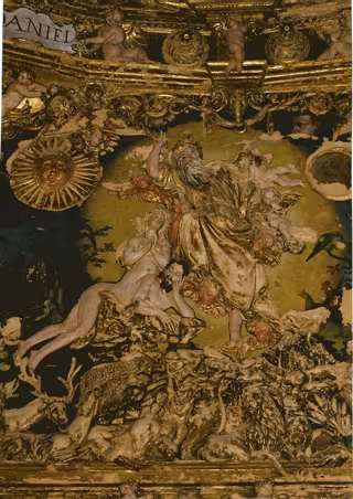 Rostros, gestos y extractos de uno de los principales conjuntos arquitectónicos renacentistas de la provincia de Valladolid. Trama compleja que conforman los pasajes del Antiguo y Nuevo Testamento, Sibilas, Profetas, Reyes, Santos, figuras fantásticas, sepulcros.