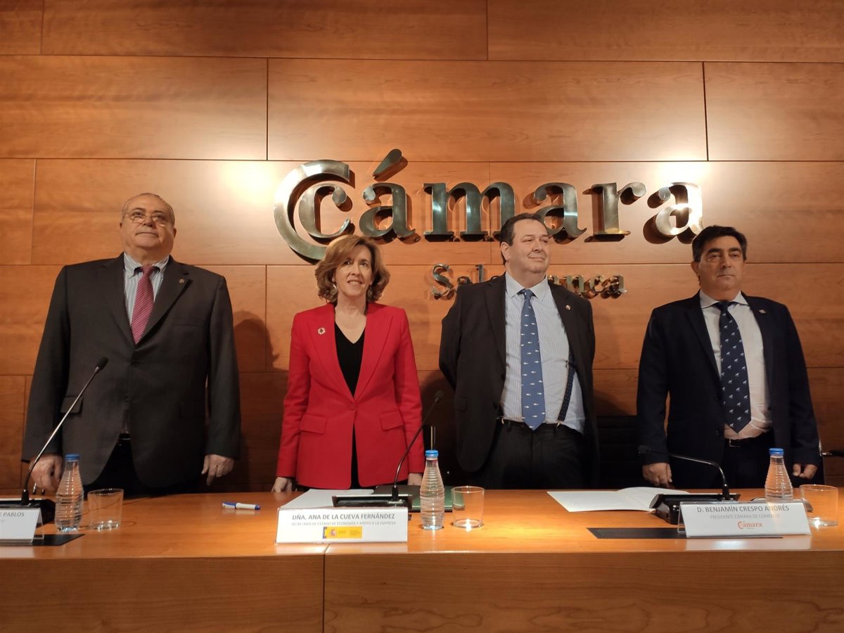 La secretaria de Estado de Economía, Ana de la Cueva, segunda por la izquierda, en la sede de la Cámara de Comercio de Salamanca. - EUROPA PRESS.