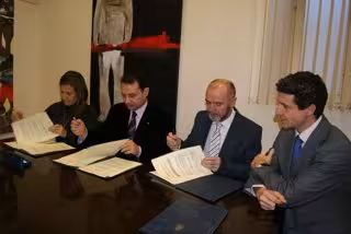 El alcalde de Segovia, Pedro Arahuetes, el agregado de Defensa en Afganistán, Luis Feliciano Herruzo, y la representante de la ONGD Fundación Cometa Fuencisla Almudena Gozalo han firmado este miércoles un acuerdo para la cooperación y financiación de la creación de un colegio en Kabul (Afganistán).