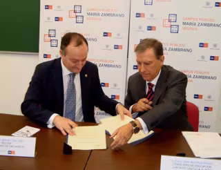 El consejero de Educación, Juan José Mateos, y el rector de la Universidad, Daniel Miguel San José, han firmado este viernes en Segovia el acuerdo de colaboración para acometer de manera conjunta la segunda fase del campus María Zambrano, que se levantará en los terrenos anexos al edificio ya construido, ubicado junto a la antigua plaza del Alto de los Leones de Castilla.