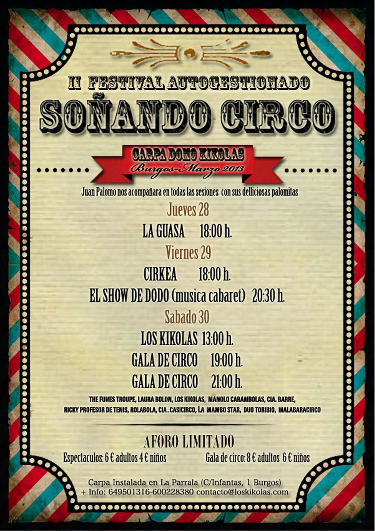 EL sábado 30 la compañía Los Kikolas presentarán su espectáculo 'Sin Remite' a las 13.00 horas y, ya por la tarde, se realizarán dos pases de la Gala Circense, en la que participan compañías como La Funes Troupe, Roupe, Manolo Carambolas, Laura Bolón, Cía. Barre, Malabaracirco, La Mambo Star, Dúo Toribio, Cía. Casicirco, Rolabola o Ricky Profesor de Tenis.