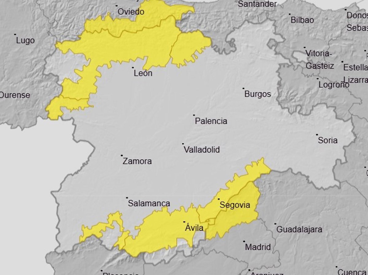 A partir de las 18.00 horas se activan avisos amarillos en zonas de meseta de Ávila, Salamanca y Segovia, donde se esperan acumulaciones menores, de 2 centímetros de nieve en 24 horas y en altitudes por encima de los 800-900 metros. A esa hora también se activan los avisos en el Sistema Central de Segovia, con hasta 10 centímetros de nieve en 24 horas y por encima de 1.000-1.200 metros.