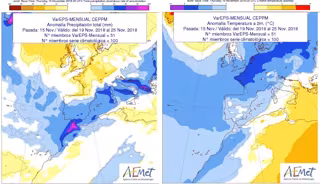 "Temperaturas máximas por debajo de lo normal en esta época y mínimas por encima de lo normal; ausencia de heladas, sólo se esperan en zonas de montaña", añade la Aemet en este mensaje en la red social.