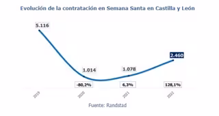 En el caso concreto de Castilla y León, Randstad prevé que la campaña de Semana Santa genere 2.460 contratos, 1.382 más que hace un año, cuando se registraron 1.078, es decir un 128,1 por ciento más que en 2021 pero 17,5 puntos porcentuales inferior a la media nacional, situada en 145,6 por ciento.