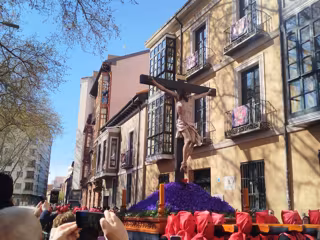 Miles de personas han acompañado este Jueves Santo al paso del 'Santísimo Cristo de la Luz', portado a hombros por la Cofradía de la Hermandad Universitaria del mismo nombre, en una despejada mañana de la Semana de Pasión en Valladolid.