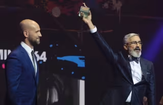 Momento de la gala de clausura de la 64 Seminci en el que Gonzalo Miró hace entrega del premio que lleva el nombre de su madre, Pilar Miró, al director Miki Molina, que recoge el galardón en nombre de Mounia Meddour por 'Papicha'. - SEMINCI