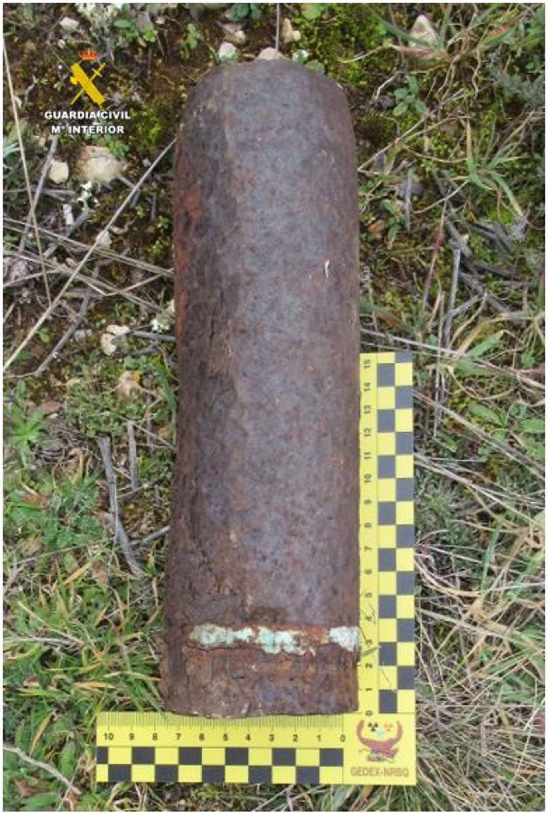 La Guardia Civil ha explicado que "rápidamente" el equipo de desactivación de explosivos (TEDAX) de Valladolid llegó al lugar para evaluar la situación y tras una "inspección minuciosa" se determinó que se trataba de un proyectil de artillería rompedor de calibre 75 mm, con la carga explosiva completa y sin espoleta.